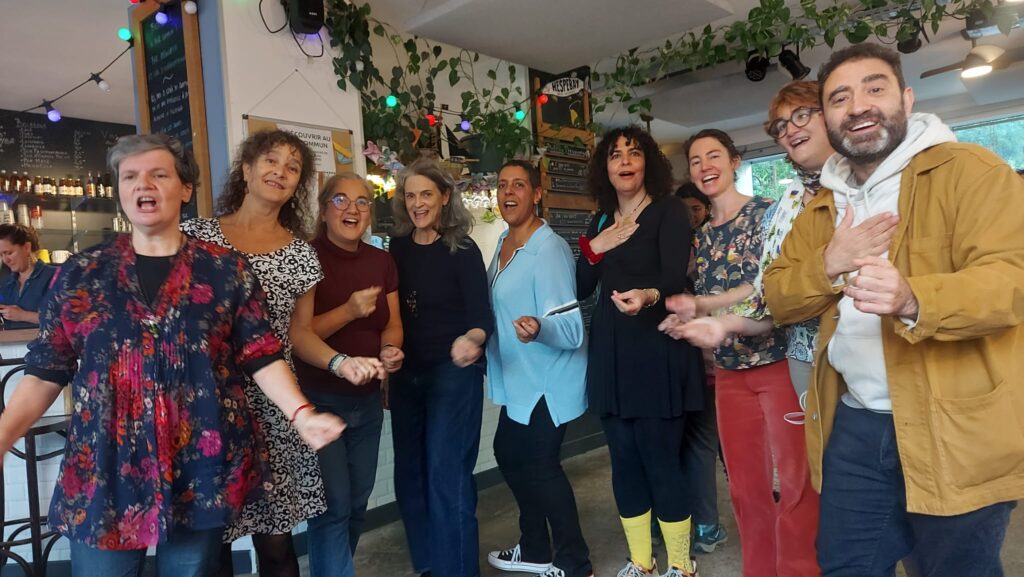 Joyeuse rencontre de facilitateur-ices en octobre 2025 à Paris 18ème ! de gauche à droite : Florence Moreau, Cécile Philippin, Inken Mieze, Kay Bourgine, Sylvie Charles, Karine Savigny, Léna Le Scornet, Agnès Gilbert et Stéphane Gabbay. Et Flor Délu qui n’était pas parmi nous ce jour-là anime les Chant Pour Tous un lundi par mois à Pigalle dans le 18ème…