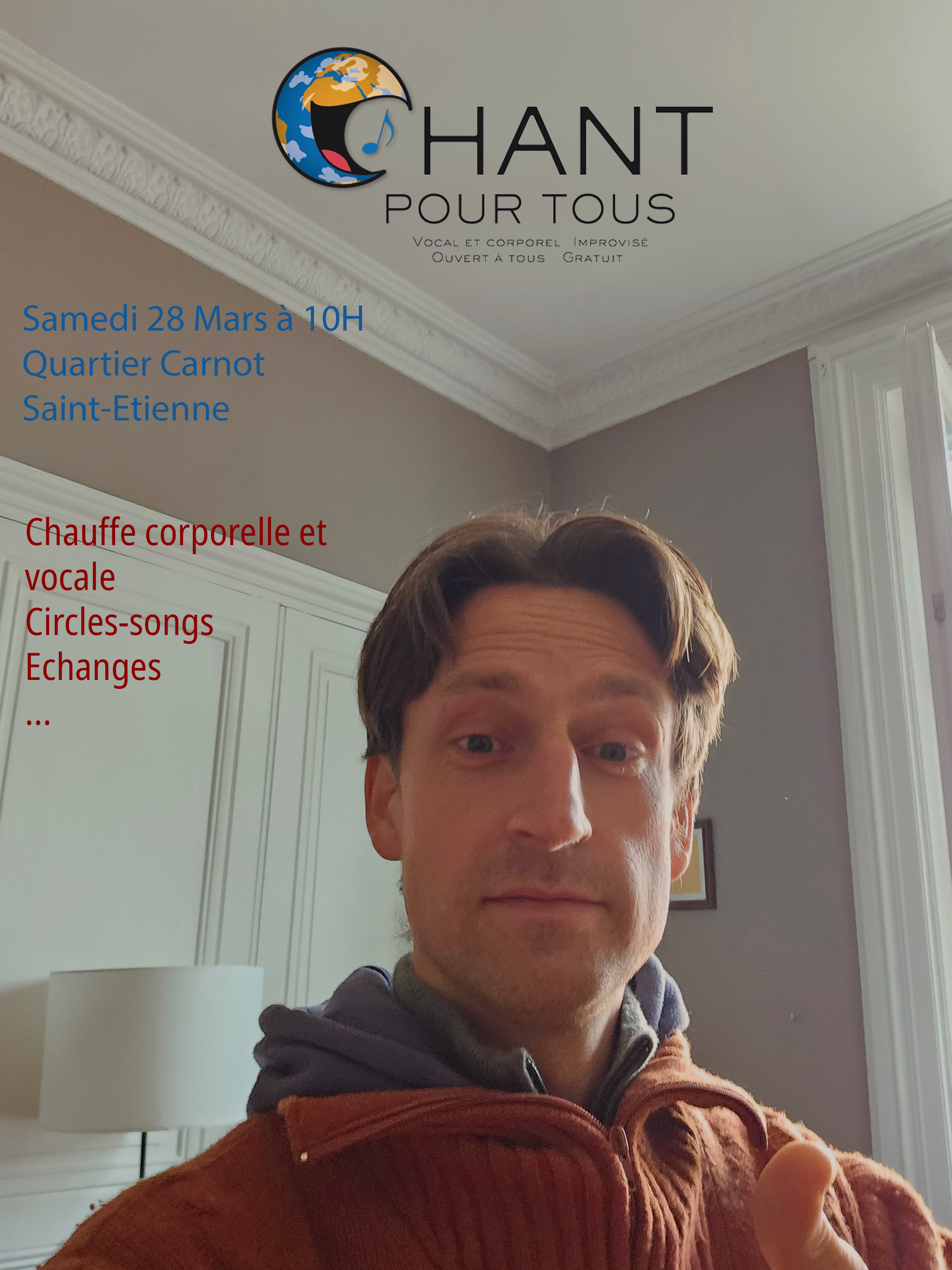 J’organise un Chant pour Tous chez moi le samedi 28 Mars à 10h, ça peut se passer au parc Montaud si il y a une préférence à être dehors.