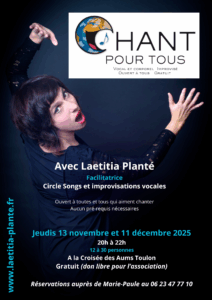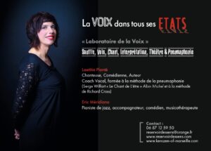 Je vais commencer à le proposer au sein de l’association, gratuitement afin d’aiguiser la méthode et le processus dans l’expérience. Donc, n’ayons pas peur de dire les mots, vous allez me servir de « cobayes » sur ces deux dates ! Je ne pense pas que vous preniez de grands risques !! En effet, j’utilise depuis de nombreuses années, l’improvisation vocale lors de mes ateliers de chants collectifs mais seulement à titre d’échauffement ou lors de clôture de séance dans mes stages de « Révéler sa voix par la pneumaphonie ». A ce jour, je souhaiterais développer cette pratique comme une forme artistique à part entière.